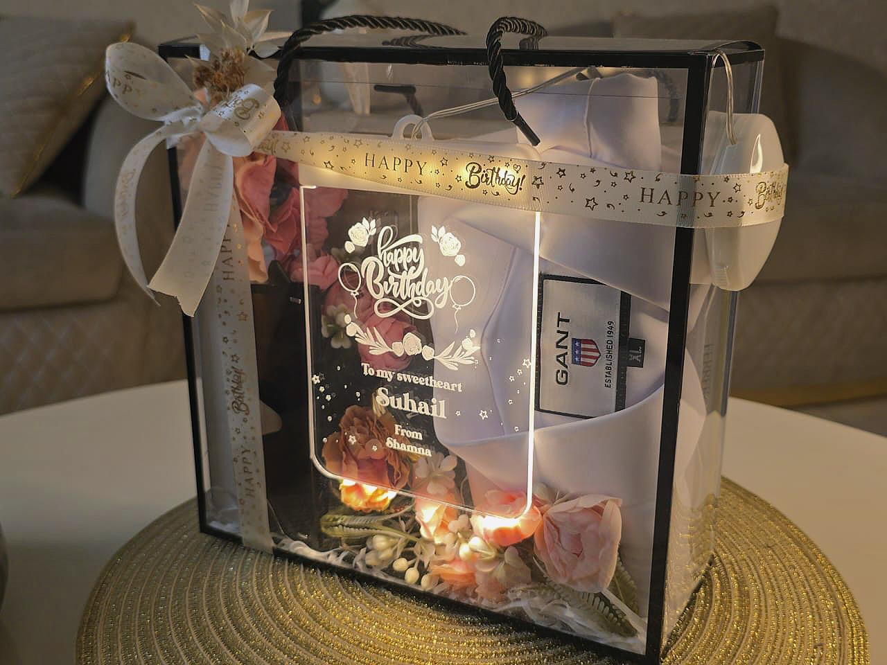 Make your gift unforgettable with our beautifully wrapped Gift Hamper, designed to impress for any occasion. Each hamper elegantly packed with premium materials that you provide and can be enhanced with a soft-glow LED light , customized design tailored to your event—be it a birthday, wedding, graduation, or any celebration. Just Give your items we will wrap them just like this, and we’ll add that extra special touch!