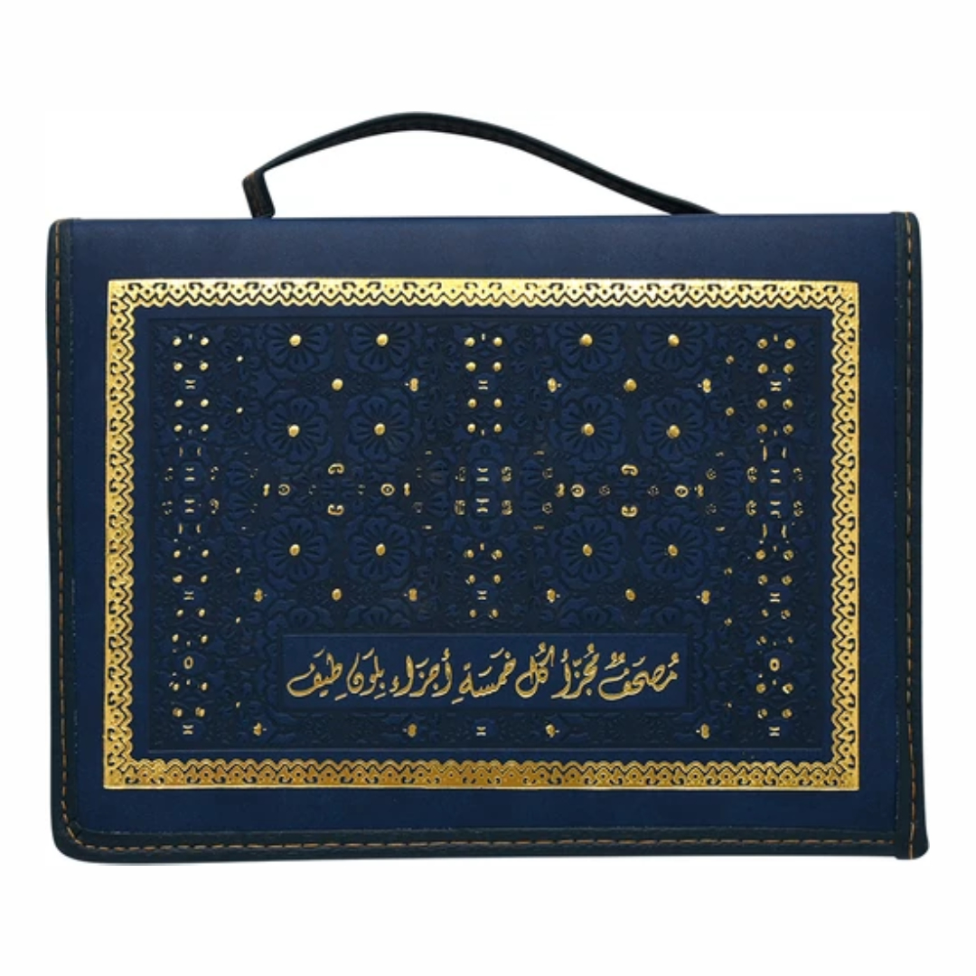 A beautiful case with a complete Holy Quran Mushaf in 30 parts, grouped by Juz through multi-colored pamphlets