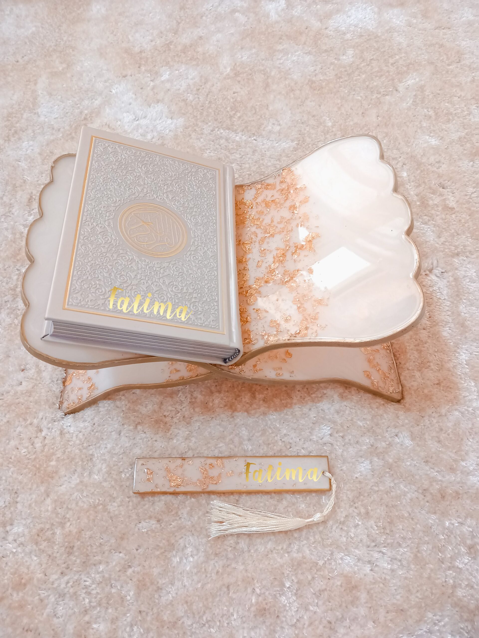 The Beautiful Handmade Resin Personalized Quran Stand Premium Bundle allows you to read Quran with comfort and style.