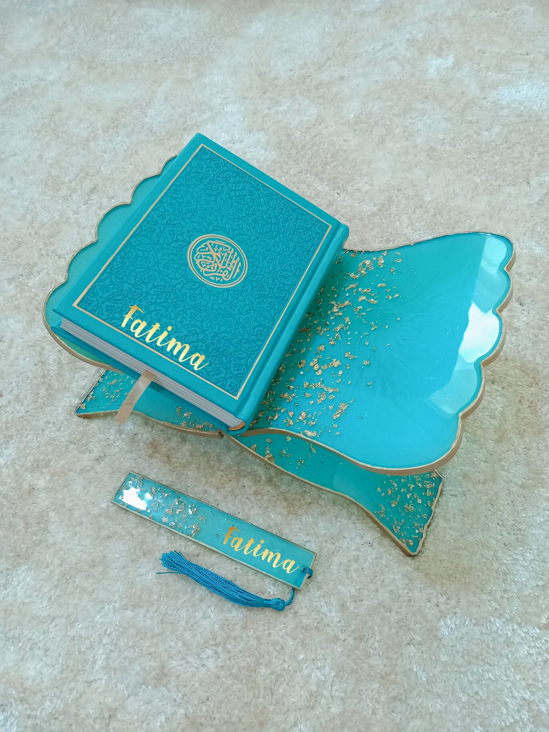 The Beautiful Handmade Resin Personalized Quran Stand Premium Bundle allows you to read Quran with comfort and style.